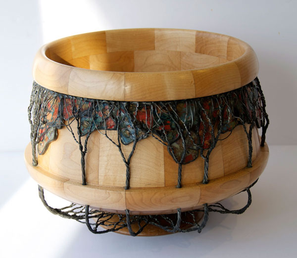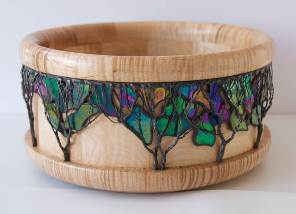 Curly Maple Bowl • Wire Trees and Stained Iridescent Glass